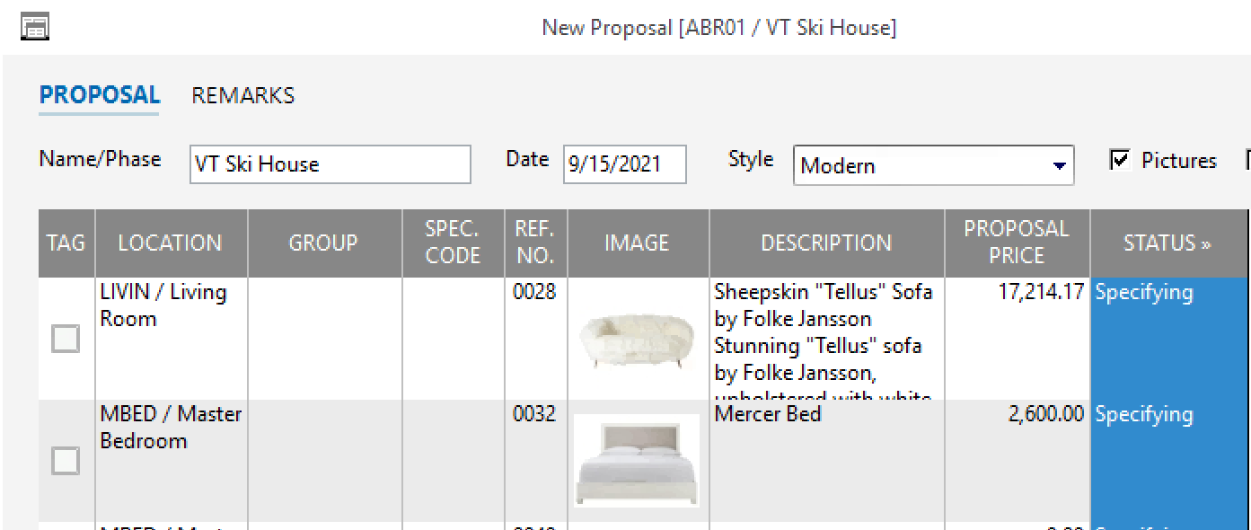 From here, you can select an item, change its name, and choose a proposal style (for example, residential, commercial, modern, etc). To include that item on the proposal, be sure to click on the check mark next to it on the left hand side, under the “Tag” column.